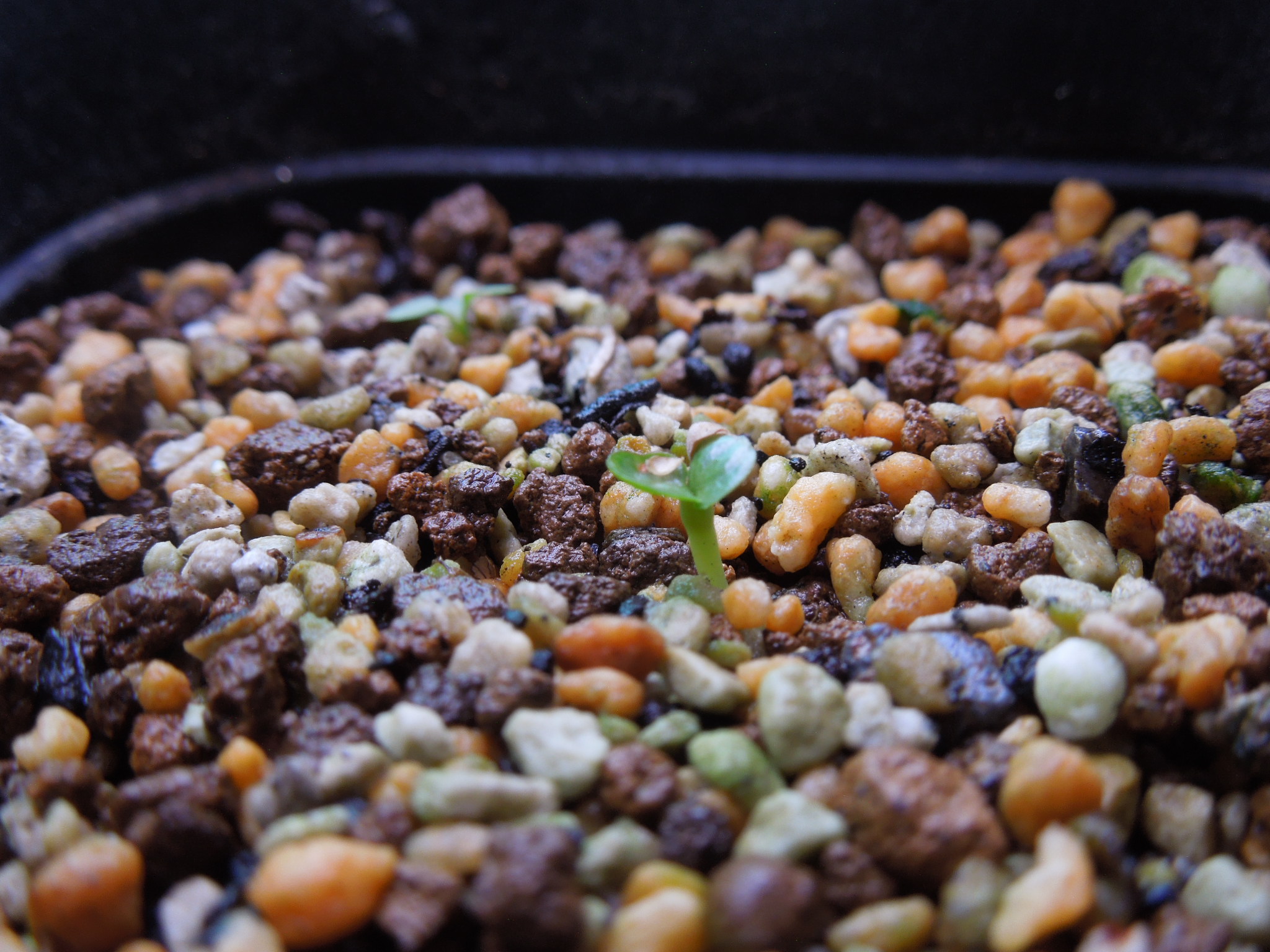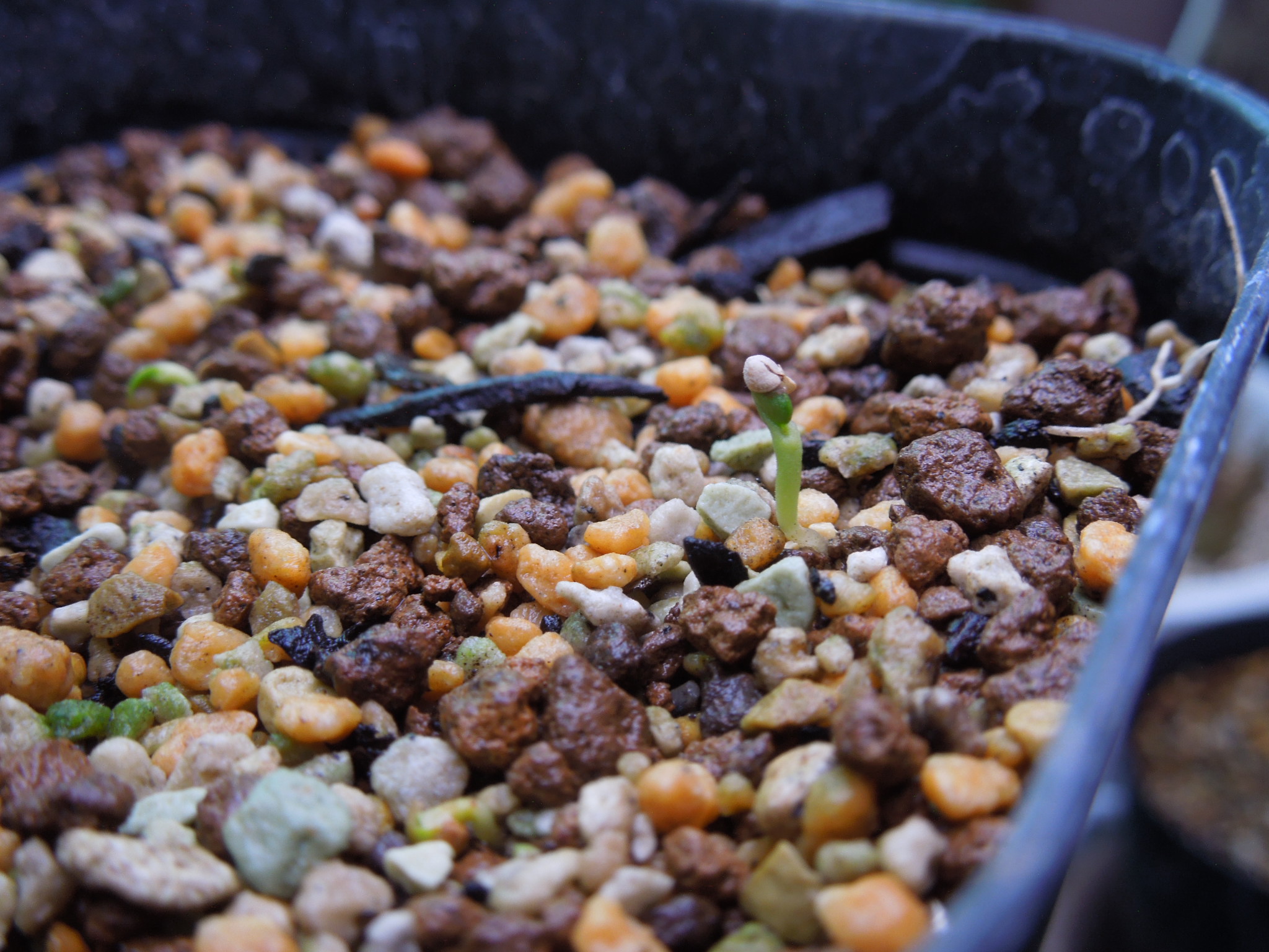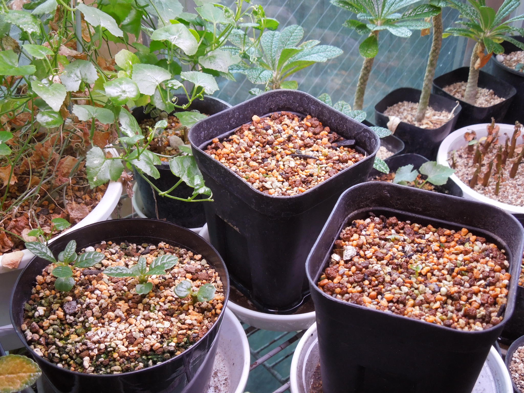 先月種蒔き、発芽した苗(丸鉢)と先日種蒔きした鉢。