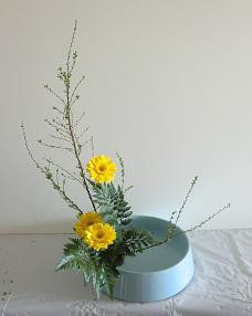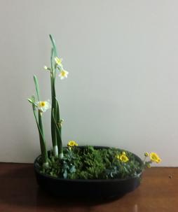 昨日は親先生の教室も今年初のお稽古でした。教室に行く前に、ひとつ手前のバス停で降りると都合が良いので、仙台市教育委員会に寄って、伝統文化こども教室が参加する伝統文化フェアのチラシを頂いてきました。これは昨年も開催されたのですが、「仙台市伝統文化活用活性化事業」に参加しているいろいろな伝統文化のこども教室が一堂に会して開催する発表会です。今年は2月9日(土)青年文化センターで開催されます。仙台市のホームページでも掲載されますが、まだ更新されていないようなので、後日お知らせします。昨日の親先生の教室では…来週は研究会のお稽古ですが、下のクラスで水仙がありますが、上のクラスでは様式などはなく、確か昨年もなかったので、しばらく水仙を触っていないのではということで、水仙が用意されていました。でも、いきなり1回目のお稽古から水仙…と言うことで、みんなが「え~っ水仙」と言うと思って、3本だけにしたそうです。小判型花器に水仙3本と小菊 今月の研究会4級の課題です。こっちも見てね 「おばさんのつぶやき」 ブログランキングに参加しています。 今年もポチっとお願いします