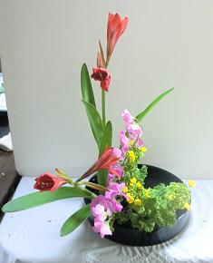 今週は研究会の後なので、我が家も親先生の教室もお休みです。それで、少し前に勉強する機会があっていけたアマリリスの様式をアップします実はこの2日後くらいになぜか主枝の花の茎がだめになって、器を小さいものにして、副の花を主に花2本のいけ方にいけなおして、今玄関にあります。よく見るとこのときすでに主枝の茎が少し弱っているようにも見えますこっちも見てね 「おばさんのつぶやき」 ブログランキングに参加しています。 きょうもポチっとお願いします