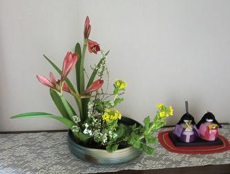 昨日から暖かくなり、きょうは3月中旬並みの気温になりました2月最後のお稽古は、今年は研究会の課題にもならなかったので、アマリリスを用意してみました。2級の方には花2・葉6、スイートピー、菜の花「丸水盤」3級の方には花2・葉5、菜の花「小判型水盤」にしてみました。 昨年2月、4級の研究会課題だったのですが、1年前にいけてても忘れていたし、2級のEさんも数年前にやっているのに忘れていましたやはり、時々やっておかないと駄目ですね~本科クラスの方は、初めて「花意匠・瓶にいける」をやりました。 じか留めで留められる花材にしたつもりでしたが、これはやはり苦戦でした瓶花花型よりは入れやすいといっても、瓶はもっと練習していかないといけませんね。こっちも見てね 「おばさんのつぶやき」 ブログランキングに参加しています。 きょうもポチっとお願いします