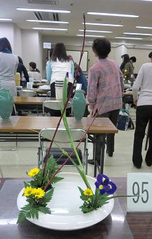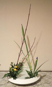 週末は今年最初の月例研究会でした。私達一級○専の課題は、ついに新花型「花奏」でした。 お稽古の時はアイリスも小菊も固い蕾で残念でしたが、研究会もアイリスは蕾でしたでも、お稽古のような固い蕾ではなく、1本は花びらが1枚出てきている感じだったので、苞を広げて花びらも少し広げて咲かせてみましたそして、きょうはその花を小学校に持っていっていけてきました。お稽古のとダブるので、持って行くことが多いです。 今朝までにもう1本のアイリスも咲きました。先日いけてきた花は、お弟子さんが行って、伸びたチューリップや菜の花を切ってまたクイックディップをつけていけなおしてくださっていたので、学校の涼しい玄関でまだ持っていました。同じ日に残花でいけた校長室の花は、暖かいのですっかりダメになっていて、きょうは研究会の花で余分がないので、玄関のまだ捨てるにはもったいない花を使っていけてきました。 ブログランキングに参加しています。 きょうもポチっとお願いします