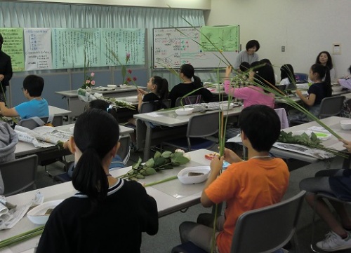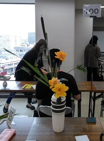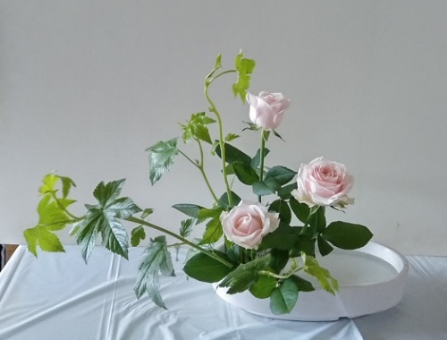 今週末が研究会ですのできょうは研究会のお稽古です。先週土曜日お稽古の日は中総体で、全校とも木曜日に代休ということできょうのお稽古に中学生も来ました。人数が増えてどうなるかと思いましたが、いつも木曜日の2級さんと2脇さんがお休みだったり、ちょうどばらけて来てくれたりで大丈夫でした。 3級の課題は枝付き紫陽花3、桔梗3「瓶花・傾斜型」 桔梗が2本、花が終わっていた感じだったので、花屋に電話したら、○専と3級の人数分しか花材がないということで、交換できず、お値段でサービスしてもらいました。師範2の課題は姫蒲2、ダリア3「花意匠・たてるかたち(瓶)」 大苦戦の中学生、研究会も頑張って!!師範1の課題はクッカバラ3、ガーベラ2「花意匠・かたむけるかたち」 本科の課題はリアトリス3、薔薇2「花意匠・たてるかたち」 にほんブログ村 ブログランキングに参加しています。 きょうもポチっとしていただけたら幸いです