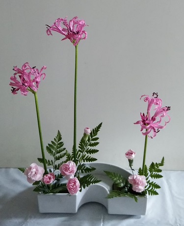 土日に新人戦が予定されていた中学生のための研究会のお稽古を、きょうに予定していました。実際には台風で新人戦は中止になったのですが、予定通り振替稽古です。師1の課題は旭葉蘭3、カーネーション2「花意匠・かたむけるかたち」これはなかなか難しい花材です。 師2は土曜日にもありましたがネリネ3、スプレーカーネーション2、レザーファン2「花意匠・ならぶかたち」 我が家の傍を通るJR在来線は、きょうも終日運休でした。県内でも堤防の決壊や河川の氾濫などの被害があった場所もあります。報道されない小さい規模なら、友人のマンションでも夜中に住人が出て水をかき出したりしたようです。皆さんができるだけ早く普段の生活に戻れることをお祈りしています。にほんブログ村 ブログランキングに参加しています。 きょうもポチっとしていただけたら幸いです