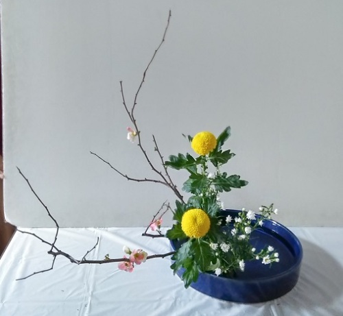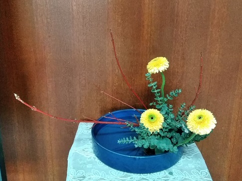 きょうは学校のクラブ活動です。先週に続いて・・・ということで1週間しか経っていない為、玄関の花はやはり大丈夫でしたので、今週はいけ替えません。今回は希望していた花材が入らず、市場に入っていたものの中で600円で出せる花材として花屋さんが用意してくれたもので、銀香梅になってしまったので、難しい花材になってしまいました次回クリスマスのお花が「たてるかたち」になりそうなので、今回は「かたむけるかたち」にとお願いしていたのです。 難しいので、主枝は私と助手の先生とで全員分を選んであげてからスタートしました。それでも「かたむける」ことが難しくて立ち気味になる「かたむけるかたち」ですが、そこは皆さん思い切って傾斜できていたので、すごいと思いました。助手の先生(私のお弟子さんですが)も、「きょうは難しかったのに、みんな良く出来ていたと思います」と言っていました。にほんブログ村 ブログランキングに参加しています。 きょうもポチっとしていただけたら幸いです