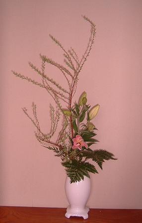 雪柳、百合(ル・レーブ)、レザーファン が用意されていましたので、瓶花にしてみました。