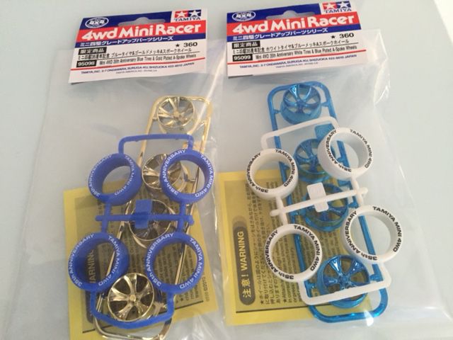 2017年6月のミニ四駆新製品発売日情報です。ミニ四駆35周年記念 タイヤ&メッキホイール私も購入しました!ホイールのみつけてみましたかっこいいミニ四駆限定 ミニ四駆35周年記念 ホワイトタイヤ&ブルーメッキAスポークホイール[タミヤ]《発売済・在庫品》価格:310円(税込、送料別) (2017/6/20時点)●タイヤサイドに印刷されたロゴが注目の記念パーツです。●ブルーメッキされたAスポークホイールと、ブラックプリントが入ったホワイトカラーのハードローハイトタイヤをセットしました。ミニ四駆限定 ミニ四駆35周年記念 ブルータイヤ&ゴールドメッキAスポークホイール[タミヤ]《発売済・在庫品》価格:310円(税込、送料別) (2017/6/20時点)●ミニ四駆誕生35周年を記念して、ゴールドメッキされたAスポークホイールと、サイドにホワイトレターを入れたブルータイヤをセット。●タイヤはコーナーで減速しにくいハードタイプです。ミニ四駆ランキング