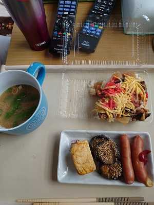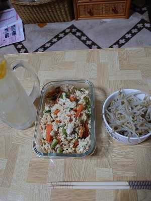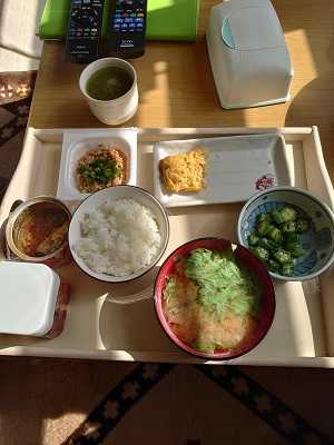 ご飯、ひきわり納豆、梅オクラ、玉子焼き、サバ缶