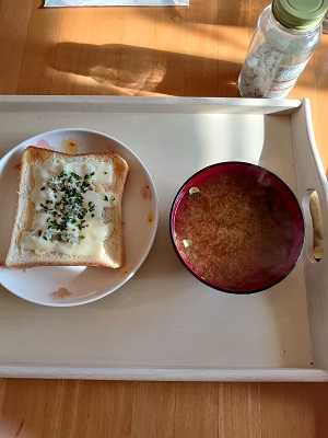 味噌汁(きぬさや、水菜、とろろ昆布)、緑茶
