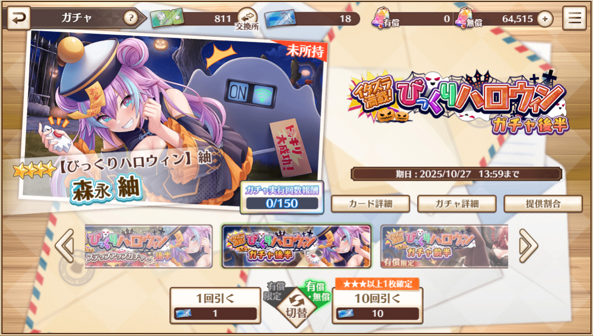 スイメドの更新、イベントの後半ガチャが来ました【びっくりハロウィン】紬が入手できます…やっぱり、☆3無いと寂しいですねぇ気を取り直して、ガチャを回します☆4が来たのは10連4回目でした【自分磨き】花音でしたこれじゃないんだよな~欲しいのはでも、今回の入手でレベル60に到達したのでOKですそして、10連5回目【びっくりハロウィン】紬、入手ですきりの良い所で手に入りましたねガチャ回数が50になったので、育成素材をおまけに貰えました入手したカードを見ましょう前回のニアのカードと対になる絵ですねドッキリが上手く行ってホクホク顔の紬ちゃん楽しそうで良いですねキョンシー衣装も似合ってます先日開催されてたオナフェスその報酬である【びっくりハロウィン】ナシュワですこれは…、赤ずきんかな?魔女っぽくもあるけどねぇゆったりとした赤いドレスが、お似合いですね手に持つマシュマロの、むにゅむにゅ感も伝わってきますあとはパズルの後半とメインシナリオの追加ですね後半パズルは、マトリョーシカと鎖の組み合わせ正直、面倒くさいですですが、稼ぎ効率はそこそこパズル10がイイ感じかな最後にコラボの告知が来ましたコラボ相手は「嫌な顔されながらおパンツ見せてもらいたい」です意外なところが来ましたねてっきり、どっかの美少女ゲーだとばかり想像してましたにしてもスゲータイトルだな(笑)おそらく、コラボで来るカードは3枚今までのコラボと同じですね交換するマイレージは充分にあるので安心してコラボイベントを迎えられますいやぁ、今日はスイメド以外にモン娘、城プロ、アイギスも更新が来たので夜から忙しかったですおかげ様で記事を書くのが遅くなっちゃいましたまだ、やる事があるのでもう少し、夜更かししていますではまたハロウィン 秋 お菓子 詰め合わせ 個包装 お歳暮 御歳暮 プレゼント ギフトお取り寄せ 内祝 お返し 御礼 お祝い 贈り物 お土産 御供 お供え ブールミッシュ スイーツ 洋菓子 GFT-C ギフトセット 16個入り 焼き菓子 吉田菊次郎