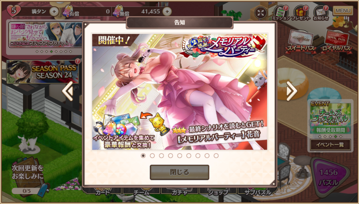 スイメドのイベント「メモリアルパーティー」のストーリーを読み終わりました今回は、メタ発言ですが、2周年を祝うため国際的な映画祭の授賞式を模した箱庭を作る事となりましたまずはレッドカーペットの設置ですお次は大理石を敷き詰めます花びらも散らして艶やかに~次は、左右の門にアーチを掲げ料理を並べるテーブルと撮影用のカメラと中継車金のロイズ像の設置ですいくら受賞式を模したイベントだからって中継車を置くのはやり過ぎじゃないですかね?金の柱と電飾の飾り付けウッドデッキの階段の所にゲートを設置うはっ!ゴージャス極まれりってぐらいに金ぴか派手だね~ウッドデッキに休憩用のソファとシャンパンを置くトロリーの設置あと、彩葉が作った料理も並べます庭の中央に巨大ロイズ像を配置でけぇ!むしろ邪魔になってないですか⁉最後に巨大スクリーンを置いたら完成ですおおっ!ちゃんと2周年ってなってる!芸が細かい!イベントを読み終わりましたので【メモリアルパーティー】花音のカードを入手ですこれまた可愛い衣装!ピンクが似合うな~腰の大きなリボンでウエストをキュッっとしてるからいつもより細く見えますね2周年イベント「メモリアルパーティー」でしたストーリーの中で、みんなが過去のイベントを思い出として語ってたりしてて、懐かしい気持ちになりました2年間、色んなイベントをやって来て、楽しかったですよね大家くんが「ほかに何かやりたいイベントはある?」と聞くとあれやこれやと意見がいっぱい出て最後は「これからもスイメドをてぃんどん、よろしくお願いします」のあいさつで締めとなりましたザ・周年イベントって感じの内容でしたね~過去の思い出話をしてる時はサービス終了でもするのか⁉と感じる話の流れだったんですけどまだまだ続くみたいで安心しましたそれに新しい住人が増える予定もありましたしねソシャゲだから、いきなり終了はあり得るけどまだ大丈夫でしょう最後に箱庭の全体像を見ましょう日中夕方夜どの時間対でも巨大ロイズ像が目立ち過ぎてる!運営はロイズ好きだよね~ではまた間接照明 おしゃれ 寝室 ネコ型 LED ナイトライト リビング ルームライト インテリア ライト ベッドサイドランプ テーブルランプ 照明 電池式 かわいい コードレス 北欧 スタンド 置物 小物 雑貨 シンプル ナチュラル 室内 照明 クリスマス ギフト プレゼント 送料無料