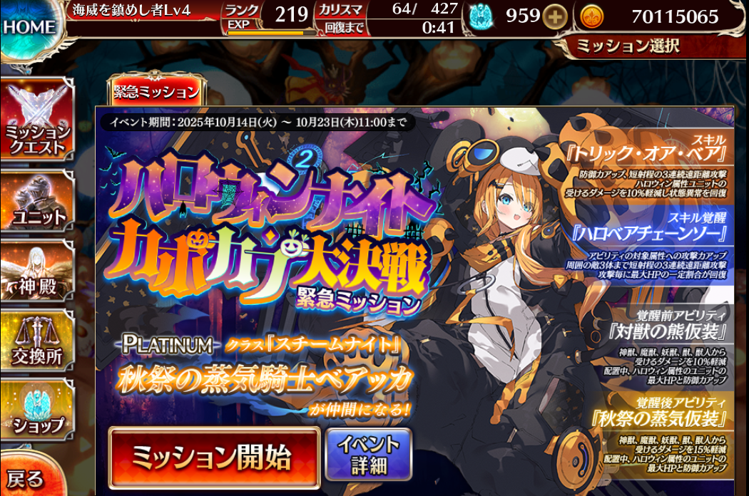 遅くなりましたがアイギスのハロウィンイベントです1週間イベントですあと、2日で終了しちゃいますけど…。結構、ストーリーが面白かったですかぼちゃとかぶの魔物が、どっちがハロウィンに相応しいかで騒動を巻き起こす展開でしたイベント報酬は「秋祭の蒸気騎士ベアッカ」上の画像は第1覚醒した物ですくまのコスプレ?をしているんだとかでっかいですねドロップ報酬なんで、コスト下限までは集めたいですね悪霊の塔に16、17層が追加されました出撃出来るのがハロウィンユニットのみと厄介な、しばり内容です今、ハロウィンガチャ開催中なんでそれを引いて挑戦してねって事なんでしょうね私はスルーでアイギスのハロウィンは、これで終わり次は、帝国イベントらしいですガチャを引くか悩むのが来たなぁその後に英傑ガチャが来るし気が早いけど、クリスマスもあるし石をどこで使うかが難しいですではまたリンドール ハロウィン 3個入