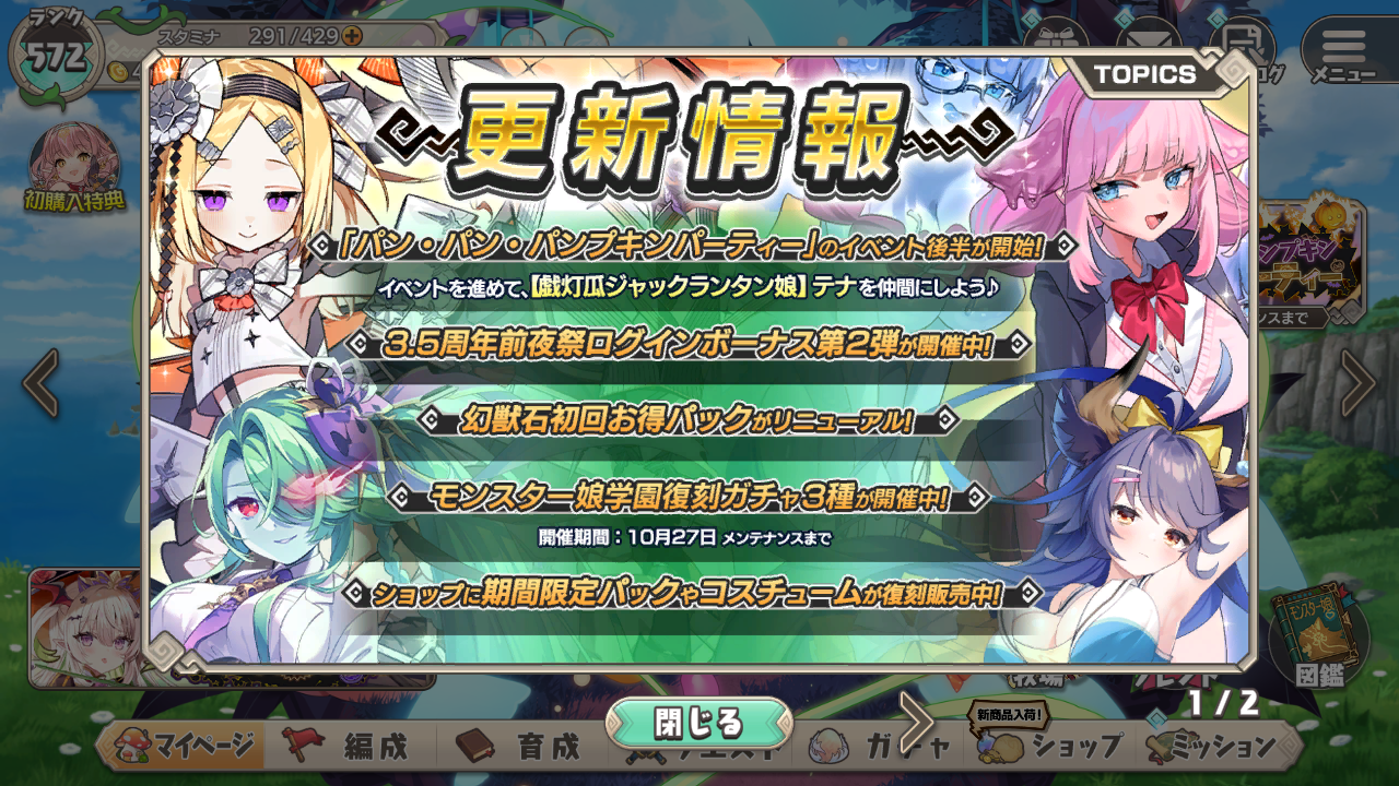 モン娘TD、タイトル絵が変わりましたイチョウの葉が舞うカフェテラスです雰囲気がすっごく良いですねウェイトレスのマージェルが目立ちますが後ろの席でアスタがおっきなパンケーキをバクバク食べてる姿が可愛いです今週の更新内容ハロウィンイベントと、新コスチュームの追加ですコラボの後は、王道のハロウィンイベでしたかハロウィンイベント「パン・パン・パンプキンパーティー」ハロウィンイベントということでジャック・オ・ランタン娘のテナが新たなユニットとして登場です魔女っ娘衣装が似合う~大きい絵はこんな感じ周りのかぼちゃも、表情に違いがあって良いですね新コスチュームは「パークのミニカボチャ服」これは!可愛いなんて愛くるしいのでしょうかこちらも大きい絵でこんな娘が来たら、お菓子を上げちゃいますよね♪最後に、ブラウザ版の方で第六回TD祭りのアンケートを開催中回答すると無料石が300個貰えますので忘れないうちにやっておきましょう私は、普段プレーヤー版で遊んでいるのでこのアンケートに気づいていませんでしたあぶね~カボチャのプリンタルト ケーキハロウィンパーティーにおすすめ