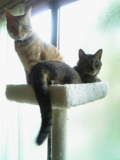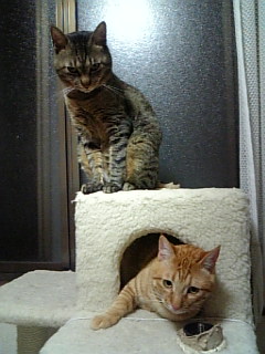 仲良しなのはいいんだけどね?そーやって、2にゃんで乗ってると折れるよ・・・「え?なにが?」「僕ら重たくないもん」・・・みたいな顔してもダメ 特に、トラちゃん。。。お餅の様なシルエットですよ。。。