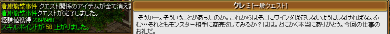 こんにちは稚菜です広場に拉致られました入ってすぐなんかU出たらしいけど残念ながら他の方へ^^;2時間ほど遊ばせてもらいLVも+1(とEXP半分)解散となったので1発クエしてみましたメロウの尻尾はすぐに集めれたのですがキングクラブの肉に手間取りました数少ないので(´-ω-`)・・・・・・まぁ何とか終了したのですがEXP30万弱ですか・・・・マズゥー・゜・(´Д⊂ヽ・゜・ 稚菜でした
