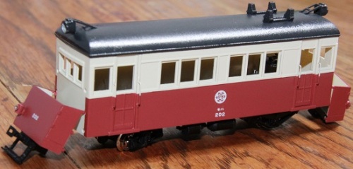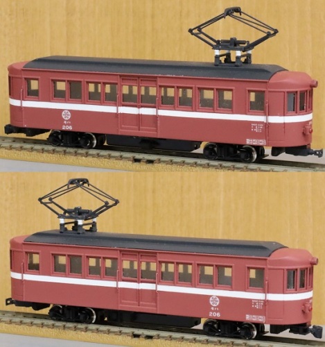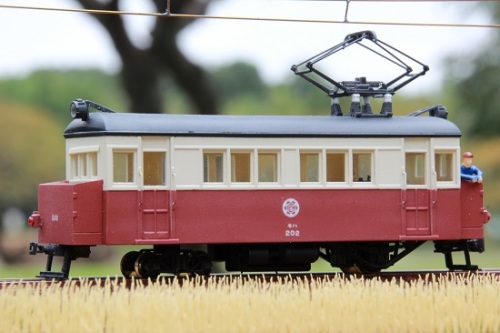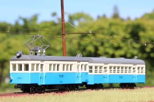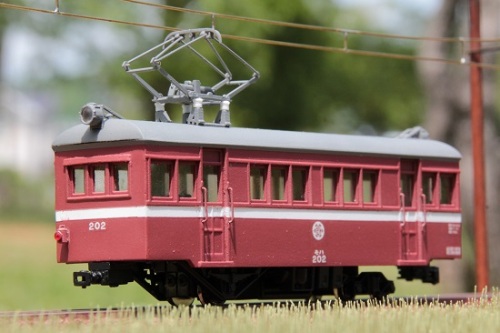 皆様こんばんは。よ~めいです。本日も絶賛引き籠り中です。模型、捗りますね……。さて、本日はモハ202(中)の塗装です。ここが一番悩むところです。いろんな文献を漁ってみると『暗緑に白線1本』と書いてあるのですが、どうしても緑とは思えないのです。と言うのは、インターネットの海から収集したモハ202やモハ201の栃尾電鉄の頃の写真をカラー写真復元サービスを使ってみての結果なのです。いくつかのサービスを使って色変換をしても上記様なワインレッドに変換され、一向に緑色が出てこないのです。上記の写真は拾い物の出所不明の写真なので一部の切り出しですが、足元に写る雑草は緑緑しているのです。この事から、『暗緑では無いのではないか。』と言うのが、軽便祭で知り合った栃尾線仲間と自分の持論です。カラー写真が出てくれば一発なのですがねぇ。そんな前置きがあり、この色に塗ってしまいました。どんなもんでしょうかね?お供の客車(アルモデルの軽便ボギー客車)と同じくアルモデルの単端も同じ色に塗りました。このモハ202の写真で見たことがあるのは単行かホハ1の2両編成なの、お供を付けたくて。路面電車のサハ306は栃尾線色に塗りました。なんか違和感(笑