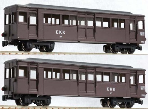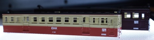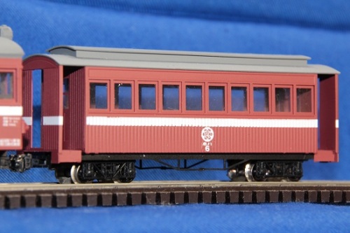 皆様こんばんは。よ~めいです。連続しての完成報告です。本日は、軽便祭後のリハビリとして購入した、アルモデルの軽便ボギー客車です。最初に完成した、モハ202(中)のお供の車両として購入・制作を開始しました。昔、猫屋線から改造した客車が手に入ればよかったのですが、もうどこにも存在していないので(再販してほしいな)似ているアルモデルのをチョイスしました。こんな感じになりました。色はモハ202(中)と同じ色で塗りました。白帯下のスペースが少なかったので表記がキツキツになってしまいましたが。台車はGMの気動車台車を仕様。猫屋線コンテストの時に指摘を受けた車輪輪心はちゃんと黒で塗りました。連結器はこの時代はピンリンク連結器なのですが、連結作業のしやすさを考え、モハ202と連結する側のみIMONカプラーを取り付けています。それなので、モハ202(中)も客車側をIMONカプラーにしてあります。最後尾はその辺りに転がっていたワールド工芸の組み立てたピンリンク連結器を取り付け。モハ202(中)との連結はこんな感じです。また、お外でモジュール使って写真撮りたいなぁ。
