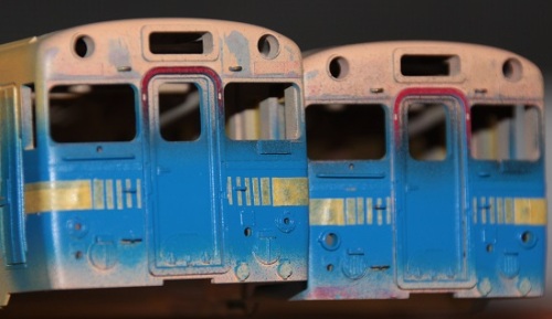 皆様こんばんは。よ~めいです。天気がいいのは良いことなのですが、スギ花粉、あなたは来なくても良いのよ……。塗装ですが、室内を塗り、内側をマスキング。左から、ホハ27(ホビダス阪急マルーン)モハ205後(上:GM小田急アイボリー、下:モリタスカイブルー)モハ206前(帯:クレオスホワイト、全体:Gaia西武レッド)と写真を見てもわかるように盛大に剥がれました……。下地処理でGaiaマルチプライマーをちゃんと塗布したのに。とりあえず全はがしする前に悪あがき。綺麗な部分を隠してもう1回塗装してみます。これでマスキングした箇所が剥がれたりして……。それだけは勘弁してほしいけど、その確率高いなぁ。