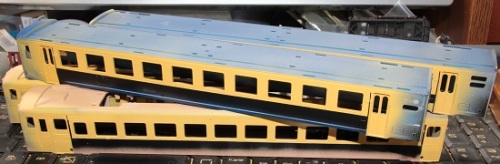 皆様こんばんは。よ~めいです。昨日は大雨で塗装はできず、本日は用事があって1日模型はできず。とりあえずは、天賞堂のクモヤ145です。ちょっと前から色々やっていて、色が剥がれて綺麗な状態になりました。前面の警戒色部分は、側面のみ綺麗にして前面は隙間が空いていますが、まぁ、良いでしょう。マスキングをする関係で、窓下の手すりのモールドは削り取り、塗装後に手すりを差し込む方式にします。さぁ、並行してデカールを作成しないと。
