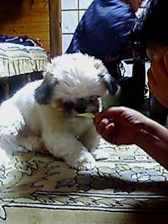 「そういえばこの前、ばば(私の母)がコロ助にリンゴを食べさせていたよ~。ママに内緒だって。」