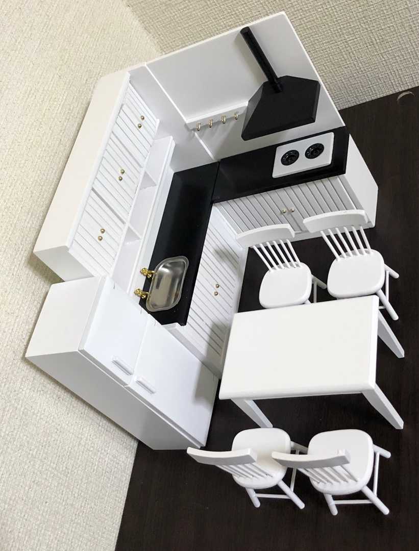 中国製のドールハウス家具〈ダイニングキッチンセット〉を購入しました。 前回の続きです。 前回はダイニングテーブルセットまで紹介しました。 【ドールハウス特売】1:12ドールハウス 家具 ミニチュア家具 キッチン ストーブキャビネット シンクキャビネット 木製 冷蔵庫 テーブル 4つチェア ドールハウス装飾 次はこちらの箱を開けます。 潰れてはいないので中身も大丈夫そうです。 開封します。 一応プチプチにくるまって入ってます。 まずはシンク付きキャビネット。 金色の蛇口と銀色のシンクが付いた、白と黒のキッチンキャビネットです。 裏面です。 きれいに真っ白。 扉を開けてみます。 きれいに開きます。破損もありません。 上部の棚は中が木の色がむき出しですが、下部の棚の中は白く塗られています。 次はコンロ付きのキャビネットです。 黒い換気フードと、その下にコンロがあります。 物を吊り下げる金色のフックも付いてます。 裏面です。 こちらもきれいに真っ白。 扉を開けてみます。 破損も無く、いい状態です。 棚の中も白く塗られています。 こちらはコンロ部分のアップ画像です。 雰囲気出てます。 横に並べてみます。 いい感じです♪ 90度に並べてみます。 いい感じです♪ セット全部並べてみます。 モノトーンのダイニングキッチンが完成しました(^ ^) こちらのセットは今回、4,000円程で購入できました。 中国からの送料込み、特に破損も無くクオリティもまあまあ、これだけの点数が入っていて4,000円なので、今まで購入したセットの中で一番お徳感がありました。 こちらもいろいろ遊びに使えそうです♪ 【ドールハウス特売】1:12ドールハウス 家具 ミニチュア家具 キッチン ストーブキャビネット シンクキャビネット 木製 冷蔵庫 テーブル 4つチェア ドールハウス装飾 【ドールハウス特売】ミニチュアキッチン木製キャビネットシルバー冷蔵庫セット1:12ドールハウス家具