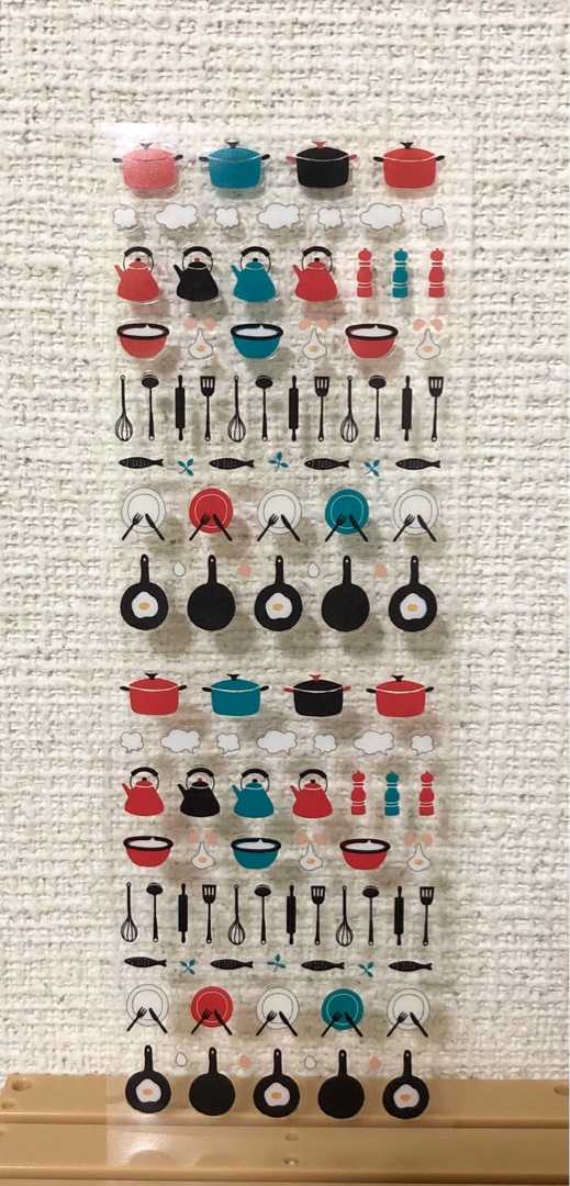 シールコレクションNo.111 キッチン道具シール キッチン道具がデザインされたシールです♪ シンプルながら、赤と緑が映える素敵な色合いが気に入りました。 スケジュール帳に使用しやすいシールです。 鍋、ヤカン、ボウルなど調理器具。湯気のシール付きです。 泡立て器、おたま、フライ返しなどのキッチンツールも。 割られた卵がGOOD。 ナイフとフォークが添えられたお皿。魚付き。 卵が焼かれている黒いフライパンがお気に入り♪ 1枚所有。未使用です。 手帳シール 飲み会とカフェ柄 1枚入【82198-006】スケジュールシール/MIDORI/ミドリ/MIDORI/株式会社デザインフィル(82198006)