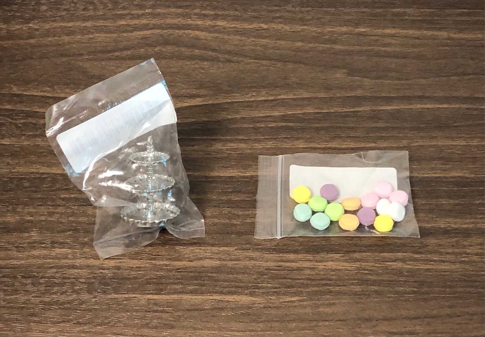 中国製のドールハウス用〈ミニチュアマカロン〉を購入しました。 商品はこのような状態で、紙袋に入って届きました。 ミニチュアマカロンとマカロンを載せるシルバー3段ケーキスタンドのセット商品です。 Amazonで860円(送料込み)で購入しました。 まずはこちらの3段ケーキスタンド。 私はシルバーを購入しましたが、ゴールドバージョンもありました。 セットのマカロンだけじゃなく、別のミニチュアの食べ物を載せたり色々楽しめそうです♪ こちらがマカロンです。15個入り。 色は7色あります。 各色2個ずつ、ピンクだけ3個入ってます。 色は単一で真ん中のクリームは色分けされていません。 素材は紙粘土なのか?すっごく軽くてフワフワ。息で飛んでいきそうなので、紛失注意ですね^^; ケーキスタンドに載せてみました。 全部載せるとピッタリサイズかと思いきや、ギュウギュウです(⌒-⌒; ) 見栄え良くするには、何個かはずしたほうがいいのかな? カラフルでとても可愛らしいマカロンセットです♪ ケーキスタンドも付いて860円ならお得かなと思います^ ^ ドール家具 ミニ 木製 テーブル チェア キャビネット 人形家具 1/12スケール ドールハウス ミニチュア用 <レジン製品 ミニチュア 雑貨 置物>可愛い♪マカロン5pcs<ミニチュア小物 ガラス細工><ガラス細工 ファニチャー>【ギフト プレゼント ラッピング】 ミニチュア カラフルマカロン★6個アソート 全部違う種類! SWMAC-01 ドールハウス用
