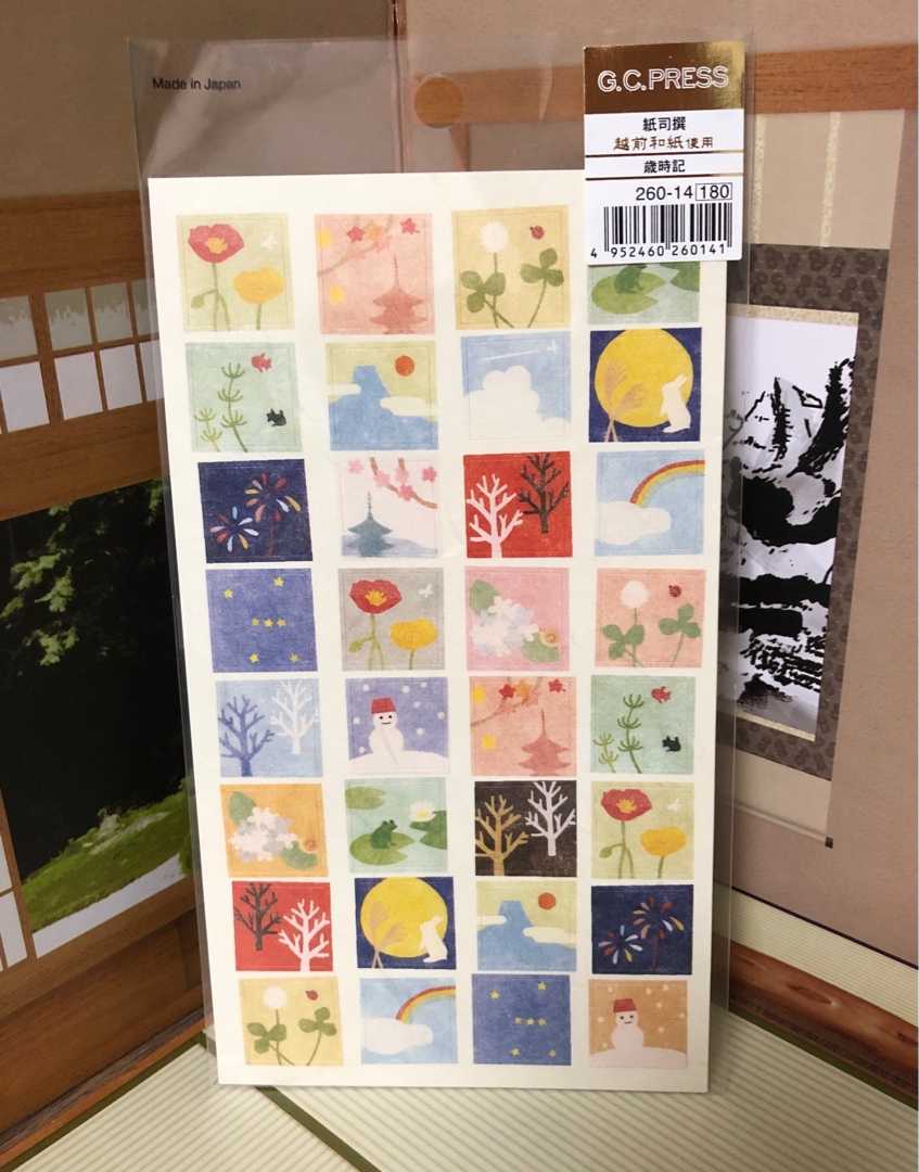 シールコレクションNo.140 歳時記シール 日本の四季をかわいいイラストにした和風シールです♪ 1シートに正方形のシールが32枚あります。 越前和紙を使用したシールです。 赤や黄色のお花、シロツメクサ、 蓮とカエル、紅葉と寺院、お月見。 金魚、花火、星座も。 紫陽花、富士山、虹と雲。 雪だるま、葉の落ちた木々。 全体的に少し淡い色使いが素敵なシール。 シールコレクションNo.141 茶のシール お抹茶をモチーフにしたイラストの和風シール♪ 1シートに28枚のシール。 四角いシールに加えて、丸い形のシールもあります。 お茶の器や茶せんなどのお茶道具に、 ひとつひとつお花が添えられたデザイン。 とてもカラフルで、すべてデザインが違う凝ったシールです♪ 各1枚所有。未使用です。