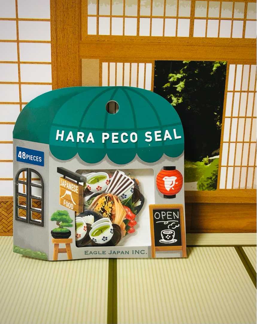 シールコレクションNo.142 はらぺこフレークシール 日本食 はらぺこシリーズ、日本食のフレークシールです♪ 緑の屋根のかわいいお店型パッケージ。赤ちょうちんが効いてます。 パッケージ裏面。 シールのデザインは8種類、全部で48枚入りです。 まずはこちらの4種類。 お茶の入った湯呑み。茶柱付きです♪ 納豆パックは箸で持ち上げている状態でGOOD^ ^ 真っ赤な梅干しの載ったご飯。 豆腐とわかめの味噌汁。 日本の朝ご飯の定番といったイメージですね。 次はこちらの4種類。 大きなたこ焼き、はみ出すチャーシューの載ったラーメン。 おでん串、寿司はマグロとサーモン。 おでん串がかわいいですね。 このシリーズのイラストが大好きです^ ^ 1冊所有、未使用です。