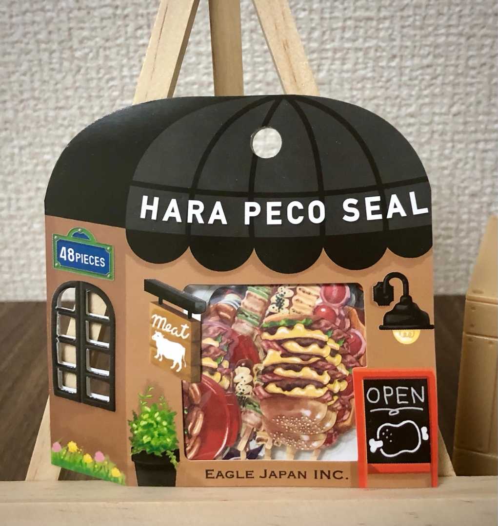 シールコレクションNo.144 はらぺこフレークシール お肉 はらぺこシリーズのフレークシール、お肉料理がテーマです♪ 黒い屋根と茶色い壁のお店型パッケージ。 裏面です。 シールのデザインは8種類。 全部で48枚入りのフレークシールです。 まずはこちらの4種類。 紅生姜の載った牛丼、焼き鳥4本。 赤い丼は豚丼かな? パック入りの高級そうな和牛も^ ^ 次はこちらの4種類。 温泉卵も載った盛り盛りローストビーフ丼、 美味しそうな照りのあるローストチキン。 チーズもたっぷり超ビッグハンバーガー! そして鉄板ハンバーグステーキ。 牛丼のシールは私の持っているミニチュアサンプルの牛丼に雰囲気そっくりでしたo(^-^)o! 大きさも揃えたように。 器は吉野家の牛丼がモチーフなのかな。丼の色合いや紅生姜の添え方もそっくりです♪ 今回も全部美味しそうなデザインのシールたちでした^ ^ 1冊所有。未使用です。