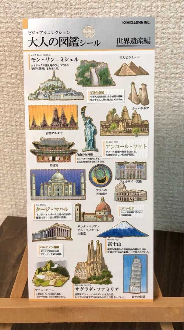 シールコレクションNo.145 大人の図鑑シール 世界遺産編 有名な世界遺産がモチーフのユニークなシールです♪ 「モン・サン・ミシェル」「万里の長城」 「三大ピラミッド」「カッパドキア」 「古都アユタヤ」「アンコール・ワット」 「自由の女神像」「昌徳宮」 「モン・サン・ミシェル」のスケールがいい♪「万里の長城」も雰囲気出てますねー。 「タージ・マハル」「プラハの天文時計」 「ヴェルサイユ宮殿」「コロッセオ」 「パルテノン神殿」 「サンタ・マリア・デル・フィオーレ大聖堂」 「富士山」「マチュ・ピチュ」 「サグラダ・ファミリア」「ピサの斜塔」 「サグラダ・ファミリア」の存在感がGOOD♪「マチュ・ピチュ」雰囲気良し♪ 世界遺産をモチーフにしたシール自体も珍しく、イラストですが割りと忠実に再現しているシールでお気に入りです^ ^ 3枚所有。未使用です。