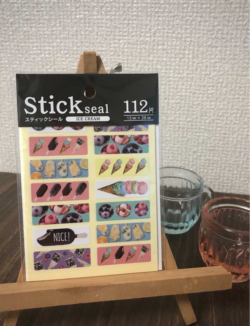 シールコレクションNo.143 100均 アイスクリームシール セリアで購入したアイスクリームのシールです♪ 横長のシールが1シートに14枚。 全部で112枚あります。 絵柄のデザインは10種類です。 同じデザインが2枚あるシールもあります。 カップに入ったベリー系アイス。 オレンジと緑のアイスキャンディー。 ジャイアントコーンみたいなアイス。 そして、チョコバーがいっぱい^ ^ 「NICE!」 3段重ねコーンアイス。 そして5段重ねアイスも! カラフルでにぎやかなアイスクリームシール。 1冊所有、未使用です^ ^