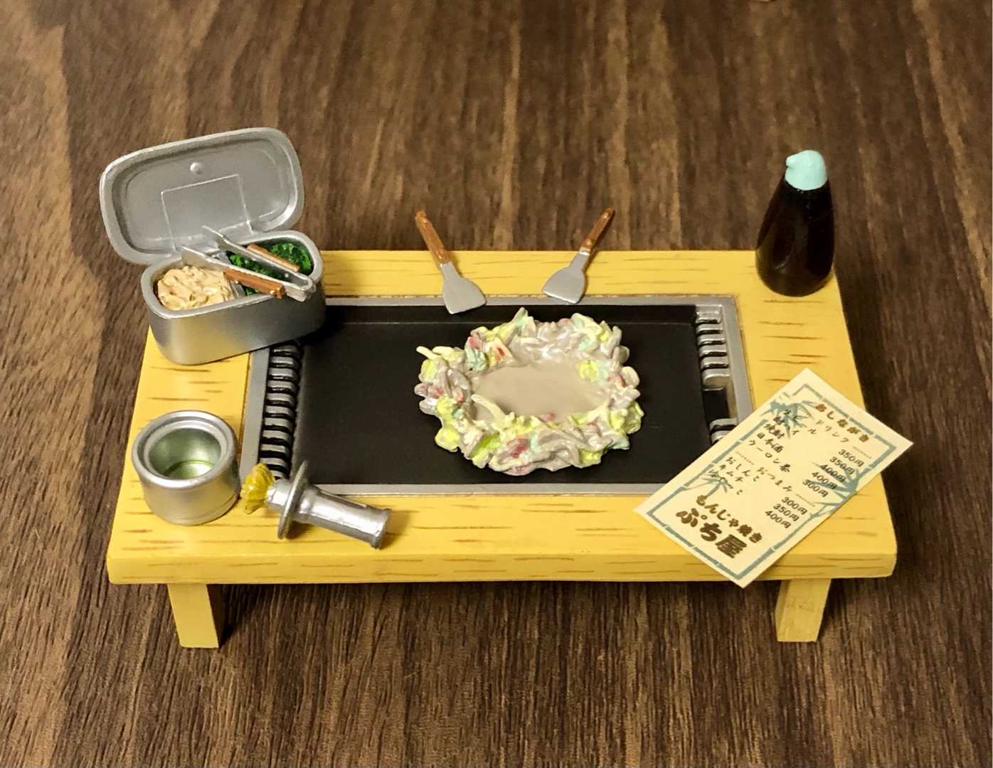 本日のミニチュアサンプルNo.1♪ 2005年発売 「ぷちサンプルシリーズ 郷土めぐり」より 『東京 もんじゃ焼き』 今から16年前に発売されたシリーズ『郷土めぐり』の中の一品です♪ 日本各地の郷土料理がテーマだったのですが、東京は「もんじゃ焼き」でした。 果たしてこれは郷土料理なのかは、、、、? 初期のリーメントらしく、細かくよくできています!! パーツを一つずつ見ていきましょう。 まずはこちら、シルバーの「油引き」です。 光沢があってちゃんと金属感が出てます。 ミニチュアだと言わなければ本物にも見える? ちゃんと取り出せます。 油を引く毛の部分がいい感じです♪ 次は薬味入れ。こちらもシルバー。 黒の取っ手が付いてます。 もちろんフタが開きます! 薬味はネギと天かすかな?? 小さなトングもあります。 こだわりを感じますね^ ^ こちらはソース? もんじゃ焼きにあまり馴染みがないので、それぞれの道具や薬味をどのタイミングでどう使うのか、いまいちわかっていません^^; よく定食屋さんなどにありそうな、レトロでコロンとしたかわいいソース入れですね♪ シルバーのヘラです。 失くしちゃいそうな小ささです。 1セットに2本入ってます。 私は2セット所有していたので、4本すべて並べてみました。 薬味のトング同様、やはり再現度高し。 そして、出ました! もんじゃの完成前の姿^o^ 完成後は付いてないんですけどね^^; カラフルな具材の感じ、土手の真ん中に流し込まれたダシ。 めっちゃ雰囲気出てます! そして、こちらもおなじみ。 鉄板の埋め込まれた座卓です。 リーメントのパーツの中では大物の部類に入ると思います。 いい出来です♪ ちなみに2セット持っているので並べてみましたが、個体差がありますね。 古いものなので、経年劣化もあるとは思いますが、座卓の木目の感じ、全体の色合いが少し違います。 最後におしながき。 細かーい字で飲み物メニューがちゃんと書いてあります^ ^ 「もんじゃ焼き ぷち屋」さんです♪ 裏面にはもんじゃ焼きのメニューが。 ちゃんと両面に印刷されていて、手抜きはありません。 すべてセットしてみました。 雰囲気めっちゃ出てますよね! さすがのクオリティです^ ^ 発売当時に自分で購入したものです。 もんじゃ焼きはダブりで2セット持っていました。 とても再現度の高い、お気に入りのサンプルです^ ^ リーメント ぷちサンプル 郷土めぐり 5 東京 もんじゃ焼き 【中古】 リーメント 郷土めぐり 10種セット【中古】 リーメント ぷちサンプル 郷土めぐり 東京 もんじゃ焼き 月島 ミニチュア【中古】 リーメント ぷちサンプル 郷土めぐり 10種セット 【中古】