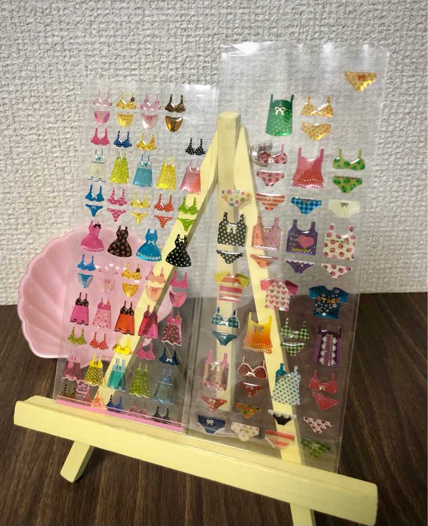シールコレクションNo.146・147 かわいいランジェリーのシールを2種紹介します♪ 両方とも半透明で、少しプックリと厚みのあるタイプです。 すでに数枚使用しているので穴あき状態です。 まず1枚目。 形は上下セットのビキニタイプ、 キャミソールタイプ、ワンピース タイプ、 ブラだけ単体のものもあります。 色柄も豊富。ヒョウ柄やボーダー柄も。 2枚目はこちら。 形はビキニタイプ、キャミソールタイプ、 Tシャツもありますね。 1枚目と逆でこちらはショーツだけ単体のものがあります。 やはり色柄豊富。 さくらんぼ柄、ハート柄がかわいい。 手に入れたのはもう10年以上前の年季ものです^ ^ 各1枚所有。