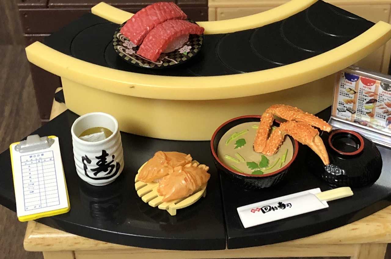 本日のミニチュアサンプルNo.8♪2006年発売 リーメント「新鮮回転寿司」より『大トロ、幸せ〜!』回転寿司に並ぶ品をミニチュアにしたシリーズです。サンプルを並べている黒い回転寿司のテーブルセットは、別シリーズのものです!1点ずつ見ていきます。まずは、アガリ。お寿司屋さんでよく見かける波打つ湯のみ🍵寿司の字体がいいですね^ ^湯のみの裏側は無字です。上から見てみると、ちゃんとお茶のティーバッグが入ってます♪透き通った緑色のお茶の感じも良くでてます。こちらはメニュー表。表も裏も同じです。お皿の色とそれぞれの値段が書いてあります。お皿です。メニュー表を見ると1番高い525円のお皿ですね。黒と金の市松模様の上に桜の花が舞っています。金色がやはりゴージャス感。お皿の裏側は柄無しの黒一色です。こちらが大トロです。色合い、質感ともに良くできていると思います。お皿にのせたところ。雰囲気でてます♪次は赤貝。こちらも繊細で赤貝のヒダの感じがちゃんと表現されています。お皿にのせたところ。本来ならこちらの赤貝用の銀皿が付属しているはずなのですが、中古で手に入れたセットのためか不足していました( ; ; )仕方がないので大トロ用の金皿にのせています。次はカニ汁🦀お椀からはみ出たカニの脚!フタを開けると三つ葉のちらされた、おいしそうなカニ汁が現れます♪カニの脚の再現度がすごい!お椀を単体で。黒に赤い縁取り。こちらも実際のものを良く再現していると思います。お椀をひっくり返したところ。このカットの入り方、リアルです!お椀の中も色むらなど無くキレイです。次はお箸。袋に入った割り箸です。箸袋に「新鮮 回転寿司」次は会計伝票。はさまっている用紙もプラスチック製です。こちらも小さいけど良くできてる^ ^裏側は黄色一色。とてもキレイです。付属のリーフレット。セットのタイトルとサンプルを使ったイメージイラスト。裏側にはメニュー表。同じくリーメントより発売されている回転寿司のテーブルに並べると、グッと雰囲気出ます。フィギュアと組み合わせて楽しく遊べます♪
