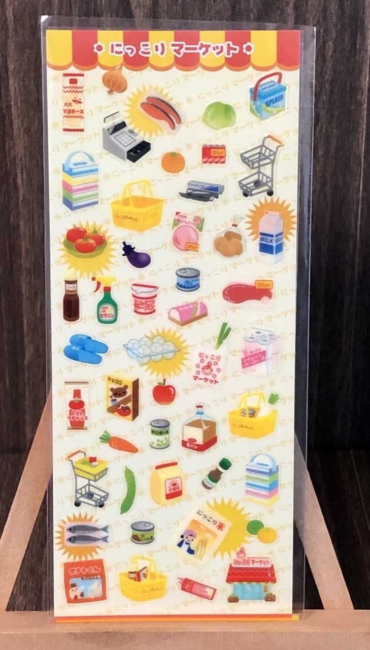 シールコレクションNo.165スーパーマーケットシールスーパーマーケットをテーマにしたシールです♪その名も「にっこりマーケット」それぞれリアルなデザインではなく、かわいらしくデフォルメされたデザインシール。魚の切り身、パック詰めの肉。ロースハム、かまぼこ。キャベツ、ナス、じゃがいもなど野菜もあります。マヨネーズやケチャップなど調味料。食材の他に、箱ティッシュやトイレットペーパー、洗剤など日用品もあります。買い物カゴやカート、レジスターまで。右下にはお店の外観のシールもあります。いつ購入したのかは忘れましたが、正直、なぜ購入したのかわからないぐらい気に入っていないシール(⌒-⌒; )1枚所有、未使用です。