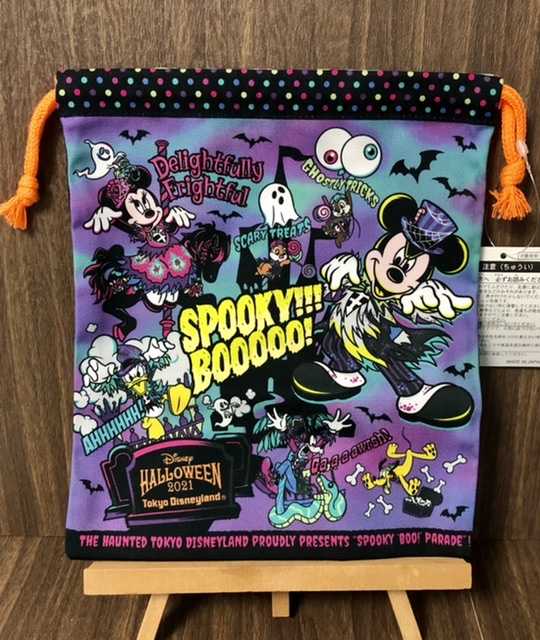 ディズニーリゾートGOODSコレクションNo.18ディズニーランド ハロウィン巾着♪2021年のディズニーランド ハロウィンの巾着袋です♪パープルベースの巾着。表にはハロウィンの衣装を着たミッキー達が踊っていてにぎやか。裏側です。こちらはブラックベース。ディズニーランドにある各アトラクションがホラーバージョンになって描かれていてユニーク^ ^巾着のヒモはオレンジ。タグもついたままです。値段は税込み850円でした。こちらはディズニーオンラインショッピングで購入しました。パークに行けない分、せめてグッズだけでもと思い購入した唯一の2021年ハロウィングッズです。