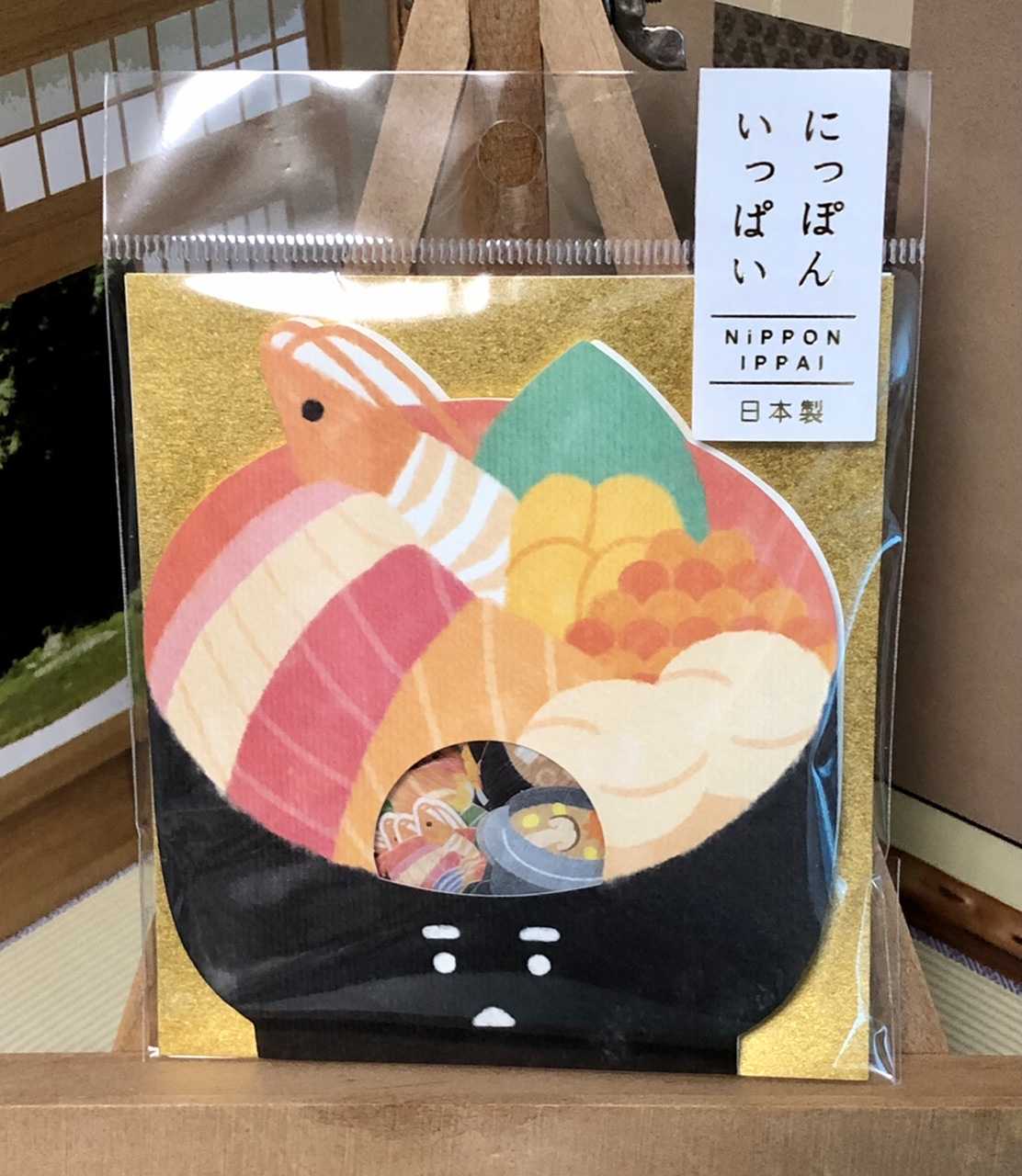 シールコレクションNo.164にっぽんいっぱいシリーズ 丼物フレークシール日本をテーマにしたシリーズのシールです♪パッケージは大きな海鮮丼型でユニーク。黒い丼には顔が描かれています。金色の台紙が高級感を演出していますね。パッケージ裏面です。シールの内容が載っています。デザインは10種類。各5枚ずつ、計50枚入りです。価格は350円税別です。まずはこちらの5種類。全てのシールに顔が描かれています^ ^シールの素材はシワのある和紙のような素材です。3色丼、親子丼、天丼。キノコの入った釜飯がGOOD♪緑の箸袋に入った箸もかわいい💕次はこちらの5種類。味噌汁、うな重、いくら丼、かつ丼、海鮮丼。こぼれいくら丼と豪華な海鮮丼がお気に入りです♪シールに顔が描かれているものは基本的に購入しない私ですが、このシリーズは描かれている顔がとてもシンプルで逆にかわいいのでOKです♪1冊のみ所有。