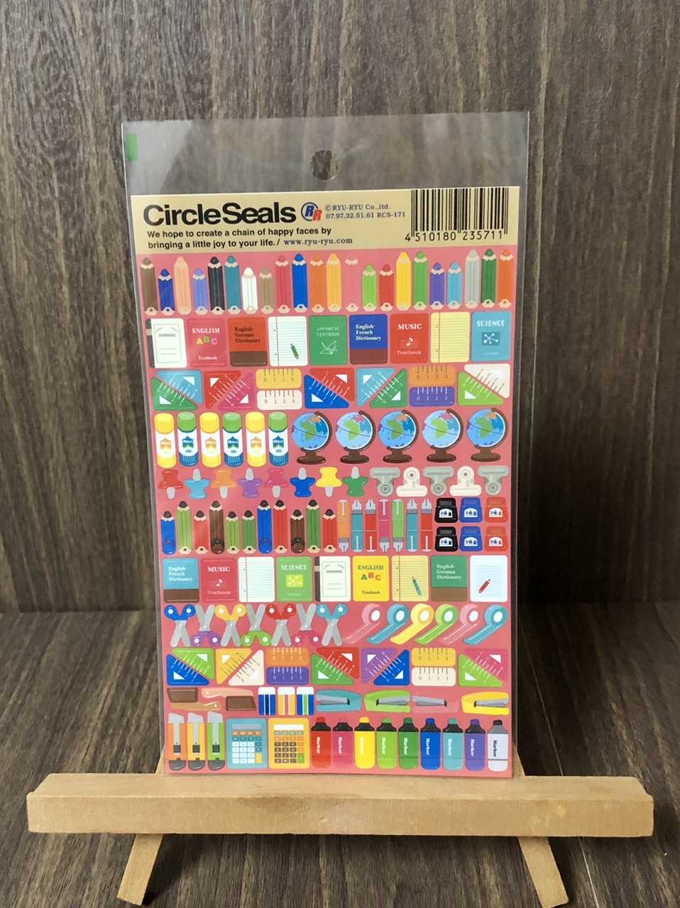 シールコレクションNo.162・No.163サークルシールの文房具シールを2種類紹介します。まずはこちら。ピンクの台紙にたくさんの文房具が並んでいます✏️カラフルな色鉛筆。ノート。定規📏📐スティックのり、地球儀。がびょう、クリップ。黒い芯の鉛筆✏️万年筆、インク瓶。下半分にもノートや定規が。はさみ、カラフルなテープ。消しゴム、ホチキス、カッター。一番下のチューブに見えるものは「マーカー」と書いてあるので、マジックですかね。ブルーとイエローの計算機がかわいいです^ ^次はこちら。紺色の台紙に1枚目とはまた違う文房具が並んでいます。クレヨン、ノート、クリップ。卓上ライト、切手、手紙の封筒。手帳、テープ、定規、色鉛筆。目覚まし時計、カギ、ミニ黒板、インク瓶。なぜカギが?と思ったら錠前もありますね🔒眼鏡、フタをとったスティックのり。カッター、万年筆、鉛筆、スタンプ。地球儀、虫眼鏡、砂時計、はさみ。絵の具、パレット、筆。ニューっと中身の出た絵の具がかわいい。各1枚所有。未使用です。