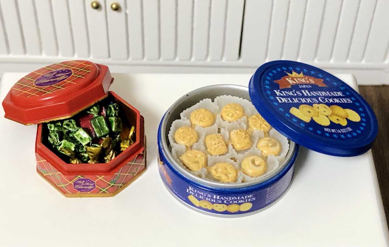 本日のミニチュアサンプルNo.9♪2004年発売 リーメント「3時のおやつ」より『クッキー&キャンディー缶』子供の頃、実家で見たような・・・なんだか懐かしい外国製お菓子缶のミニチュアサンプルです♪クッキー缶とキャンディー缶のセット^ ^未開封の状態から開封します。1点ずつ紹介します。まずは青いクッキー缶🍪今でもこんなクッキー缶は売られているのかな?フタを開けると、中はきれいにシルバーに塗られています。丸い缶のサイドにも、クッキーの写真の入ったシールが貼られています。こちらが缶の中身のクッキーです♪白いプラ容器に色んな形のクッキーが入っています。クッキーは容器から取り出せます。バラバラにならないように一つ一つ繋がっています^ ^白いプラ容器はクッキーの数に合わせてちゃんと細かく区切られていてリアル。缶の中に入れてみます。プラ容器に入ったクッキーがピッタリ2段収まるようになっています。次は赤いキャンディー缶🍬八角形のレトロなデザイン缶で素敵です♪フタを開けると、こちらは中がゴールドに塗られています。中に入っているキャンディーたちです。チョコレートに見えなくもない感じですが🍫グリーン、レッド、ブルーの包装紙のキャンディーがひとかたまりになっているもの。ゴールドのキャンディーが3つくっついているもの。グリーンとゴールドのキャンディーは単体もあります。細かく分かれているところにこだわりを感じますね^ ^キャンディーを缶に入れてみます。こんな感じで収まるようになっています。やはりカラフルでGOODです♪こちらはリーフレット。シリーズタイトル、セット名と中身の写真がプリントされています。リーフレット裏面には「おやつ絵日記」が。ヤスさん・・・?宝物を入れる宝箱として外国製のお菓子缶を使いたい、と書いていますね( ・∇・)リーフレットを開くと、このようにお店風の立体的なつくりになっています。「ここにフィギュアを置いて飾ってね!」昔のリーメントらしく、とてもとても繊細なつくりのミニチュアです(⌒▽⌒)特に缶の中に入ったクッキーとキャンディーの造形、色付けが細かくリアルなところがお気に入りです♪フィギュアと組み合わせて、楽しく遊べるセットです(o^^o)リーメント ぷちサンプル 明治のチョコで至福のおうち時間 全8種 1BOXでダブらず揃います