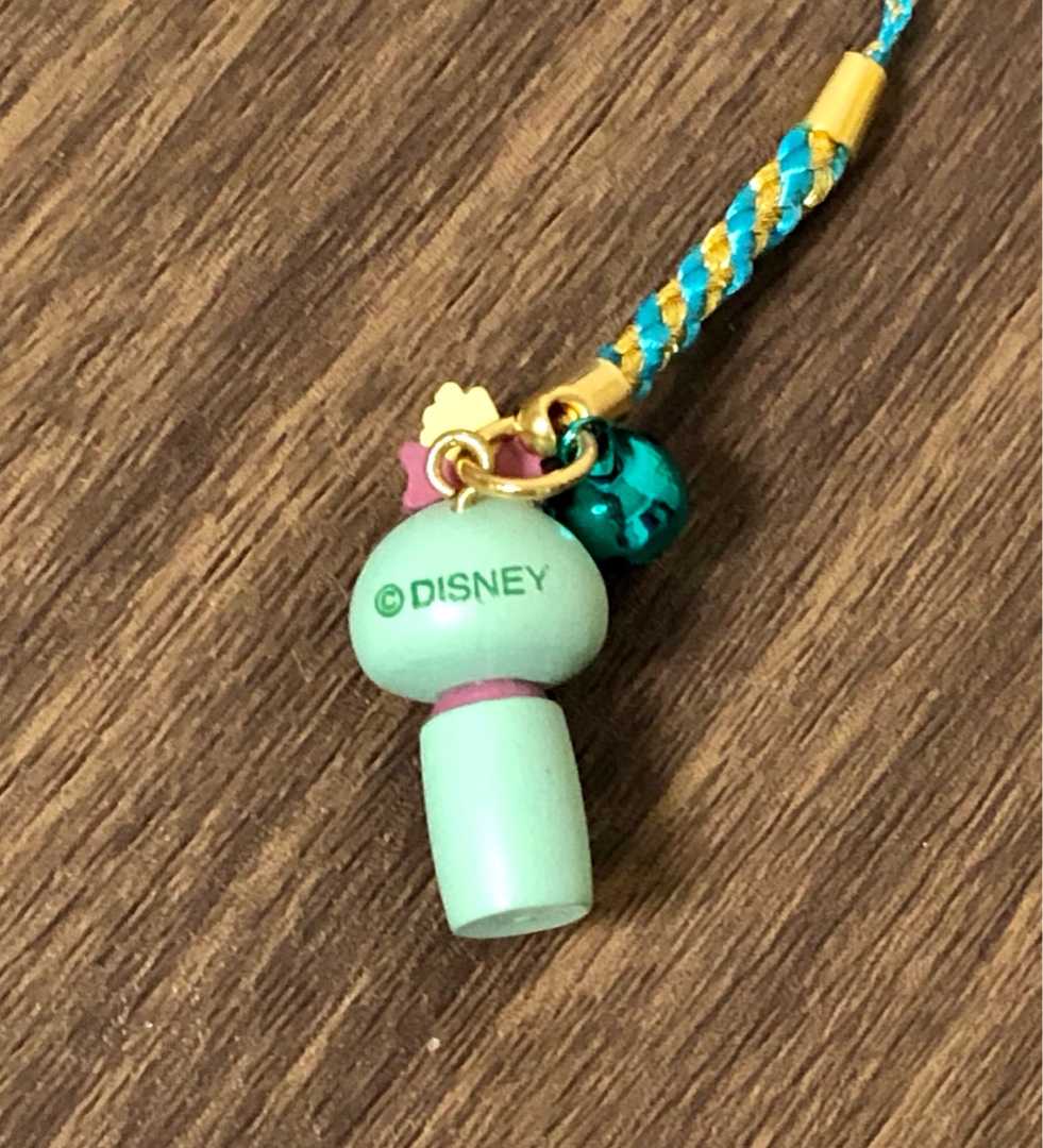 エメラルドグリーンとゴールドのヒモ、エメラルドグリーンの鈴が付いています。