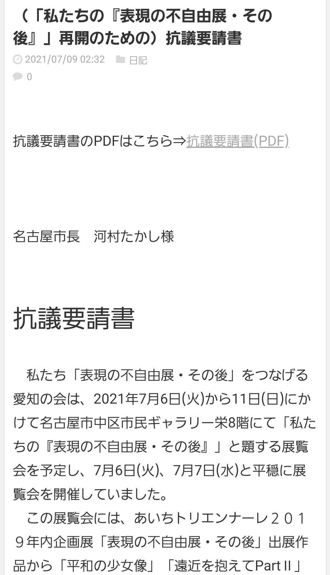 大村秀章愛知県知事 2021年7月6日 臨時知事記者会見の中で中日新聞の記者から、名古屋、栄のギャラリーで開催される私たちの表現の不自由展について質問されていたので文字おこししますーーーーーー中日新聞記者コロナとは関係のない話なんですけども本日から名古屋市内の方であいちトリエンナーレで一時展示が中止になった表現の不自由展その後の作品を展示する展示会が始まりましたけども会場では一時 反対派が抗議するなどあったようですけどももし知事の所感があればお聞かせください大村知事いや、まぁあのぉ~、おー、名古屋市の施設にぃーまぁそうしたあのぉーえーーーー・・・・まぁそういうあのぉー展覧会をやられるぅですねあのぉえーー団体さんがーえーー通常の方法でぇーーまぁあの普通ー一般的な方法でぇまぁ申請してぇえーーーまぁそれがぁあの許可されてまぁあのーーー名古屋市のねえーー中区民・・センターの会場でしたっけ?えーーーそこでぇやられるということでありますのでえーーまぁそうそれぇーーまぁ私達・・直接ぅーー関係してる立場ではありませんしぃーーまた、個別の事実関係についてはあの・・いしゅるる・・(聞き取れない)立場にはなりませんのでそういう意味では、そういう展覧会をやられる団体さんが普通に申請されてえーーー名古屋市の施設でまぁ普通に許可が出てまぁ・・開催がされてるよいうことかと受け止めておりますそれ以上でもそれ以下でもありませぇんということなんでまぁ何も言ってないのに等しいかも知れませんけどえーー要はぁ特に私がコメントする立場でもありませんしコメントは特にないということであります騒動に巻き込まれたくないから知らないとさ