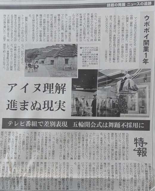 中日新聞特報 アイヌ理解、進まぬ現実ウポポイ開業1年記事は有料なので紙面でどうぞ開業当初から「これ本当に昔の物?」と怪しまれる展示物や急にアイヌで儀式に使うから勝手に魚を獲らせろというヤカラが出るわアイヌ理解以前に何やお前ら?と思ってはいる東京五輪の大会ビジョンに「多様性と調和」とあるのにアイヌの伝統舞踊は不採用に、せめてマラソンや競歩が予定される札幌会場での披露を期待していたが「公式発表できるものは何もい(内閣官房アイヌ総合対策室)」シドニーやバンクバーでは先住民族出てきたのに!↑なんで最優先されなかんねんポッと出が調子のんなと思うそんな中加藤官房長官が札幌市でのマラソン・競歩のゴール付近でアイヌ舞踊をやらせるんだとさほら、ねじ込んできた
