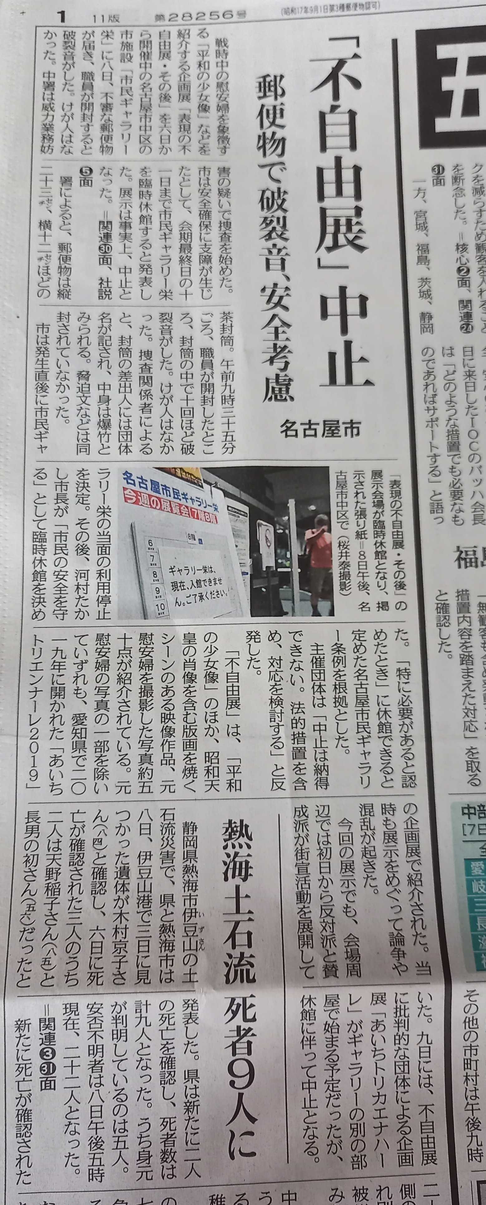 中日新聞が1面、社説、30面で名古屋、市民ギャラリー栄で開催している私たちの表現の不自由展その後でおこった郵便物破裂事件のことを書いてる市民団体側は破裂した郵便物を開けた職員の心配する言葉もなく、再開を河村たかし名古屋市長に要望書を出したそうだ名古屋市長選で河村たかし落選運動やってたくせにね、そして今日は市役所前でデモやるらしい市の担当者やギャラリー栄の管理者、警察と連携して再開へ動くならまだしもそんなことよりデモをする何やってんだ?と思うよ今回は封筒を開けた人が怪我しなかったから良かったものの、それを心配もせず表現の自由が、暴力には屈しないとか言う奴らは信用ならないぜ他人を蹴落としても平気な奴らと変わらない大村秀章愛知県知事のコメント事実関係を知りうる立場でないのでコメントできない関係者で話をして、円満に解決していただければいいと思う↑あいちトリエンナーレで表現の自由・不自由に関わるのが本当に嫌になったというメンタルだだ漏れコメント、情けないもんだね