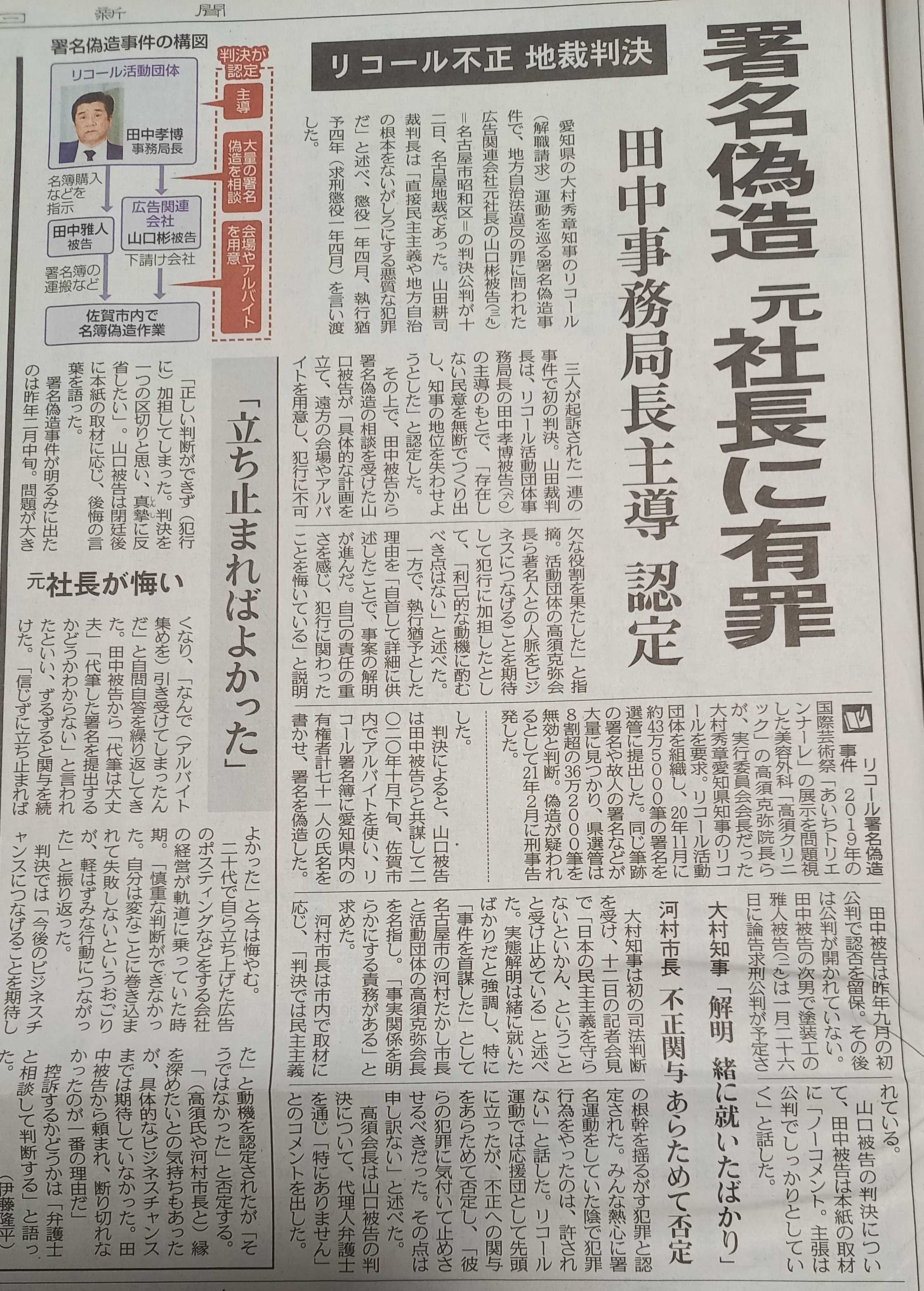 大村秀章愛知県知事リコールで田中考博事務局長が署名偽造をした問題広告会社社長の有罪が言い渡されたそうだ大村は「高須克弥、河村たかし」を首謀者というがリコールを始めることは権利であって問題はないそれなのに「署名偽造の首謀者」という大村の勝手な思い込みでコメントしてる構図を見ても高須、河村の名前はないので大村個人の感想でしかないよなー