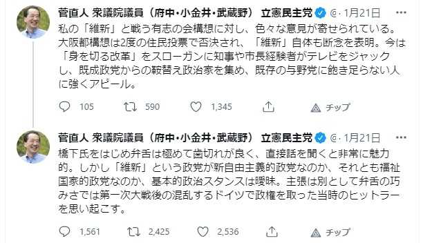 悪夢の民主党政権で残念ながら首相だった菅直人のツイッターアカウントで維新に、橋下徹氏に対して「ヒットラー」とツイートした問題維新は立憲民主党に抗議文を出す予定で党の見解を聞く様子だが立憲民主党逢坂は会見で菅直人個人のことなので党としては対応しないみたいな発言菅直人立憲民主党に捨てられる自分で尻を拭けるか