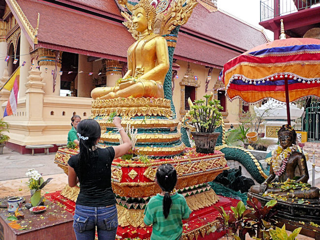また、人々は寺の境内やメコン川の川原に出かけて、砂で小さな仏塔を作り、また、市場へ行って生きたカニ、魚、小鳥などの小動物を買って、メコン河に放してやることで、功徳を積み、来世の幸せを願います。