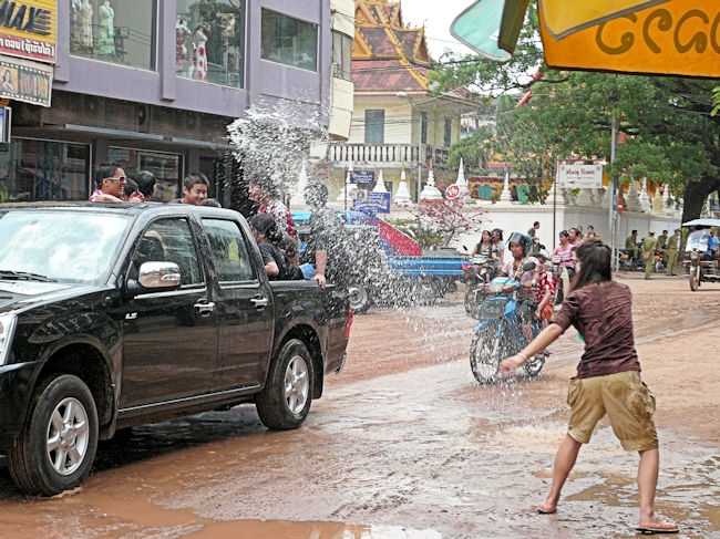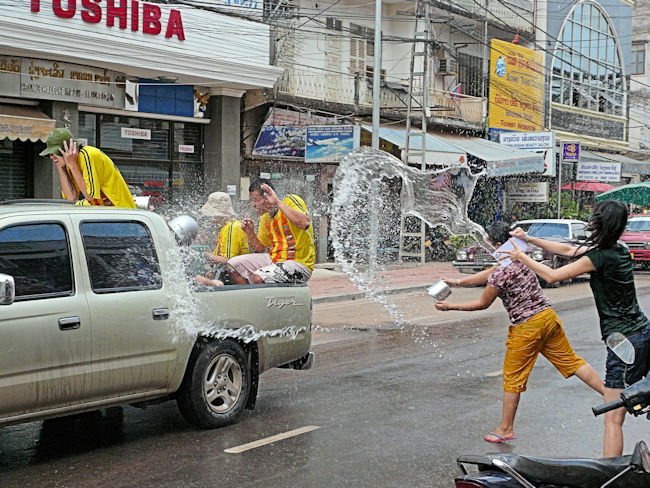 Lao New Year takes place in April, the hottest time of the year in Laos. Water is used for washing homes, Buddha images, monks, and soaking friends and passers-by. Students first respectfully pour water on their elders, then monks for blessings of long life and peace, and last of all they splash water at each other. The water is perfumed with flowers or natural perfumes. Some people prefer flowers in the water to give a pleasing smell, as well as adding other things, like cologne and perfume.