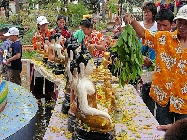 人々は寺に集まり、安置されている仏像を取り出して洗い清めます。また、村の長老や両親など敬愛すべき人に対しても水をかけます。