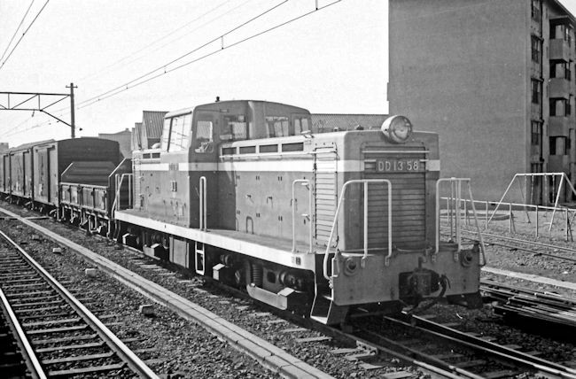 写真は、1968年に板橋駅ホームから撮ったDD1358です。 板橋駅は1996年まで旅客、貨物両用の駅でした。池袋駅寄りの東側には住友セメント、同西側には日本食糧倉庫、赤羽寄りには紙倉庫への専用線がそれぞれ引かれていて、セメント・砕石・砂利輸送の専用貨物列車や普通貨物列車が運転されていました。 1969年頃まで貨物列車の牽引は蒸気機関車D51DD13、さらにDE10へと変わりました。 DD13は、ヤード構内での車両入換作業に用いることを主目的として開発され、それまでのサイドロッド式駆動台車をやめ、シャフトとギアにより2軸駆動するつりあい梁式DT1059600形の使われている規模の大きなヤードで使用するにはもっと大型の機関車が必要とされ、軸重がとローカル線(丙線)での運用には大き過ぎる等の欠点があり、入換用途に特化したDE11形が開発された1967年に製造が中止されました。 Bon appétit !】 The DD13 was designed primarily for use as a switching locomotive for use in yards.Despite being billed as the definitive switching locomotive to replace steam locomotives, a number of issues, such as the axle load made the DD13 unsuitable for work in large scale yards and it being too heavy for certain branch lines. When they entered service, the DD13s were mostly used for switching and pulling freight trains, rarely pulling passenger trains. Production was discontinued in 1967 due to the introduction of the DE11. (https://locomotive.fandom.com/wiki/JNR_Class_DD13)