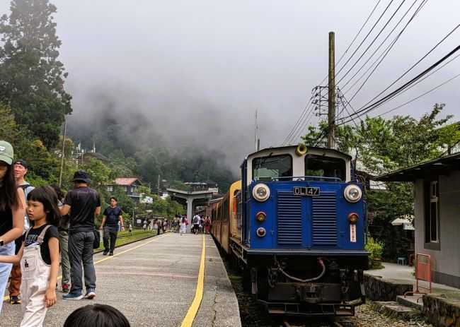 平地での 2 枚は、嘉義駅で撮ったものです。ここから阿里山駅まで 5 時間かけて登っていきます。機関車は先頭に連結されて客車を引っ張っていくことが一般的ですが、ここでは、客車の一番後ろに連結されて、客車を後ろから押して山に登っていきます。